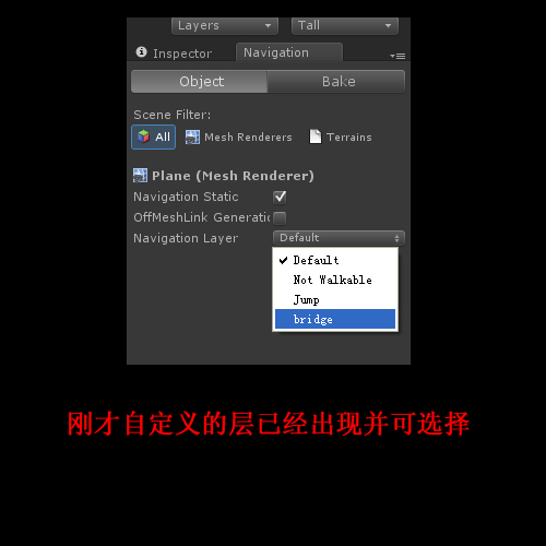 Navigation Layer是對參與尋路功能的地圖物體的一個分類,用層來分類,默認有三個層可以選擇,當然也可以自己添加層。