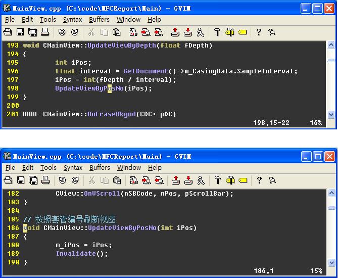 用gvim打開(kāi)一個(gè)代碼文件,將光標(biāo)放到某一函數(shù)名上,如下圖的UpdateViewByPosNo(),按下"ctrl+]",光標(biāo)會(huì)自動(dòng)跳轉(zhuǎn)到定義處。