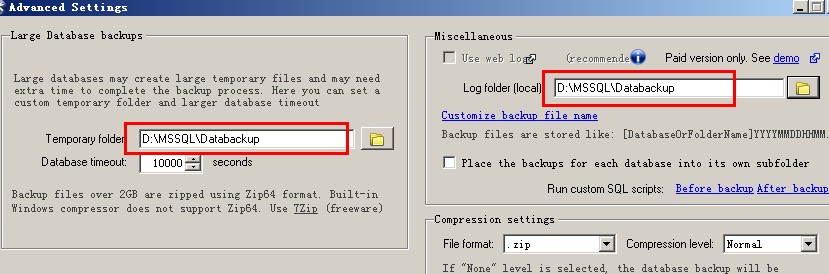 我把備份數據庫日志和大型數據庫臨時文件的路徑都設置在D:/MSSQL/Databackup