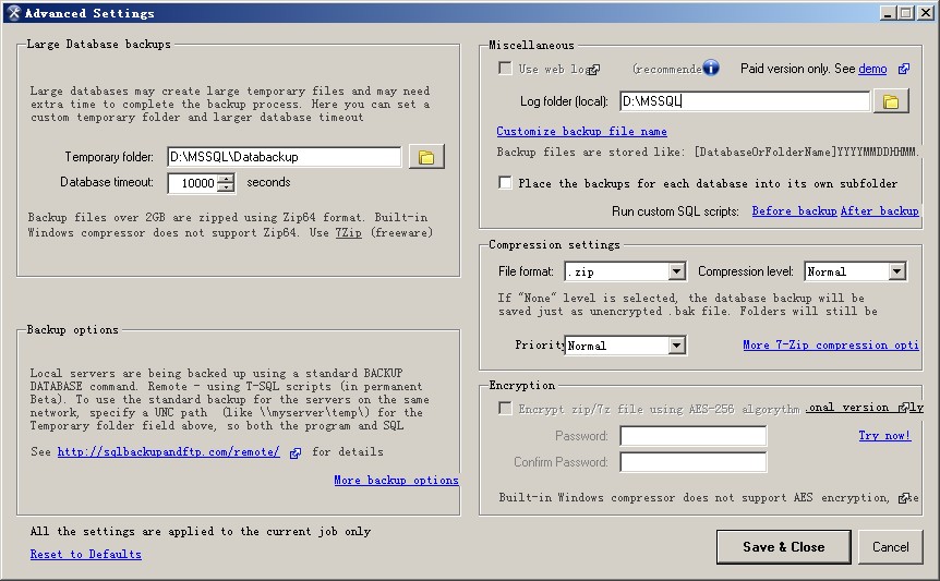 設置備份選項,包括大型數據庫臨時文件存放路徑,壓縮備份文件選項,是否校驗備份文件,備份數據庫日志存放路徑,加密備份文件(收費)