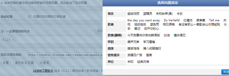 插件還人性化的提供多種提示音,當有車票的時候會進行聲音和右下角彈窗提醒!
