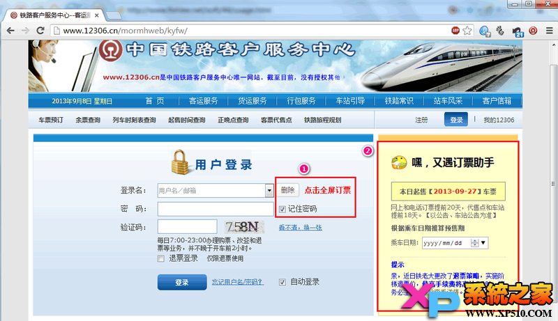 可以看到上圖1中標注的,官方不支持記住密碼的,而插件支持,并支持全屏訂票,還有一個小細節就是,當我們輸入完賬號、密碼驗證碼,在有插件的情況下自動點確定登陸,無需我們再次操作,很人性化啊!還有右側的2中標注的,直接提示今天起售哪天車票,不用我們再次計算了,還附帶一個乘車日期計算工具,選中乘車日期自動幫忙算哪天起售,好好利用這個工具啊!