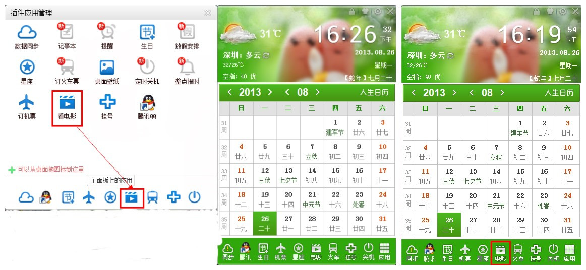 人生日歷還有一個很便捷的功能。人生日歷應用插件管理也可以將桌面上的圖標直接拖進去進行管理,例如,我們可以將QQ圖標拖到人生日歷應用插件頁面,然后再將QQ圖標拖到人生日歷的主頁面,這樣在人生日歷的主頁面就可以添加QQ圖標了。以后在人生日歷的主頁面就可以快速登錄QQ。我們可以把自己喜歡的軟件圖標拖動到人生日歷的主頁面,這樣就不需要再在一堆桌面快捷方式里“艱難”的尋找自己心愛的軟件了。