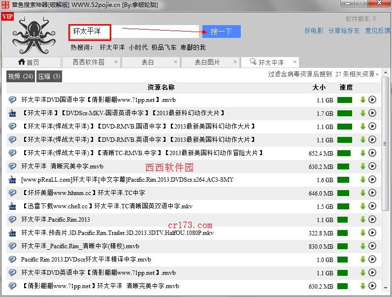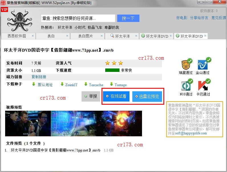 西西上面搜到了環太平洋這個電影,這個時候我們要確認下真假,點擊播放按鈕!