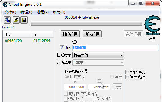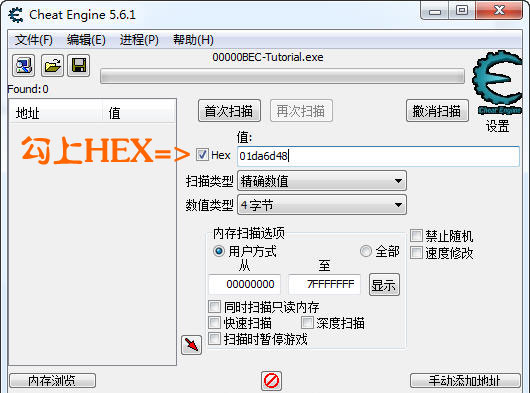 一定要勾上HEX,否則CE在搜索16進制字母時會報錯。