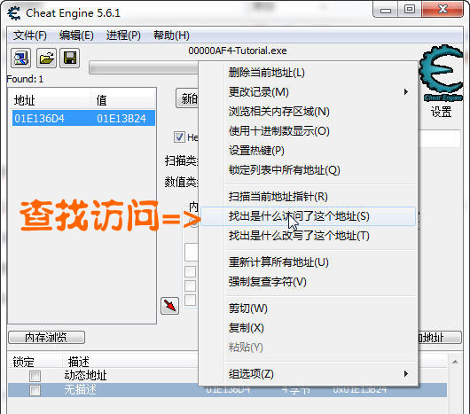然后把新地址 01E136D4 添加到地址欄,在地址上右鍵=>選擇 查找訪問的地址。