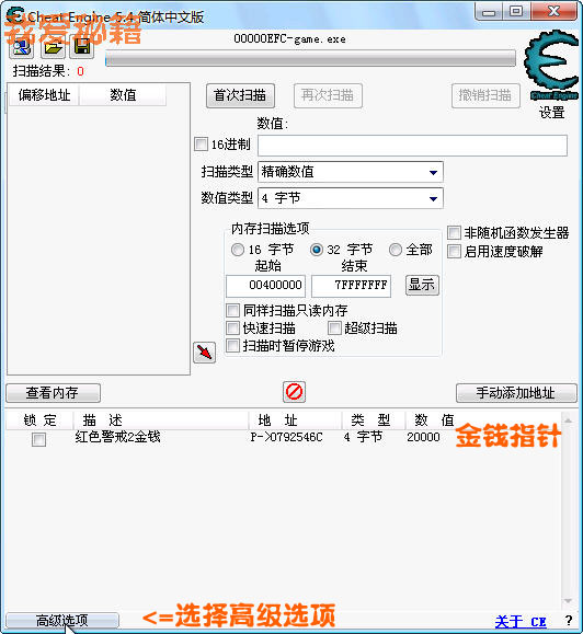 點擊 首次掃描 然后出現了肯定是N多的結果,因為太多了,CE沒有顯示出來。