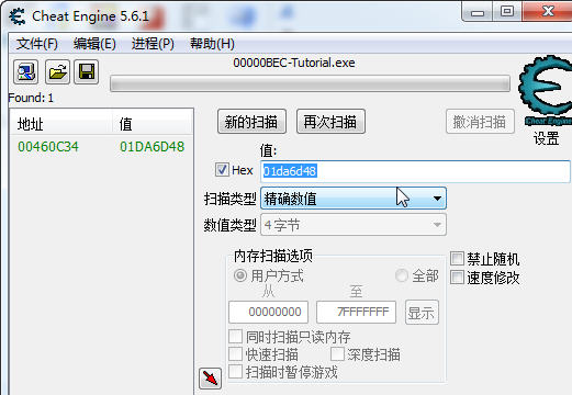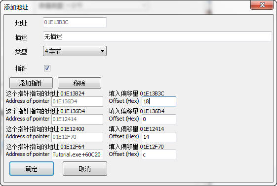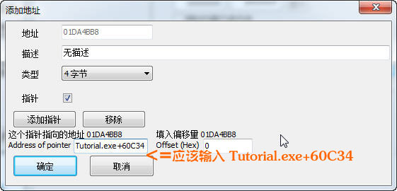 一般來說游戲在電腦中申請的地址是從00400000開始的,Tutorial.exe代表的就是 00400000 然后加上 60c34 自然就等于 00460c34。
