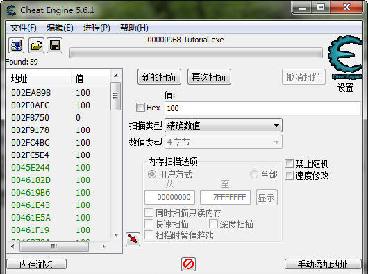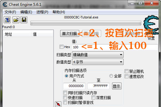 現在開始搜索精確數值 100 數值中輸入 100 點擊 首次掃描 按鈕