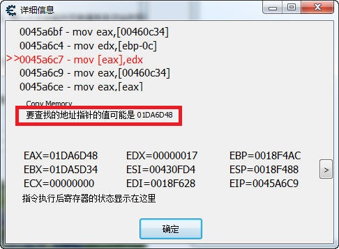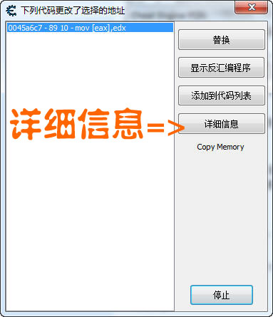 然后出現一個信息框,具體的代碼是什么意思就不解釋了,CE會告訴你下一步該做什么,圖: