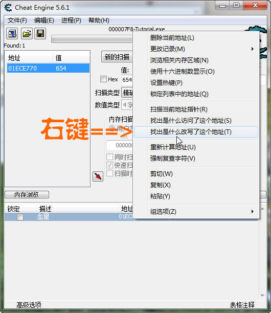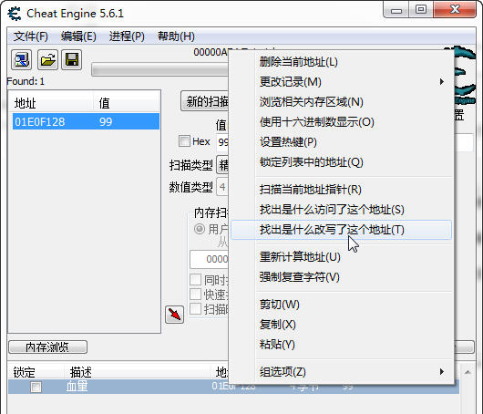 先找到血量的內存地址,不會找的先去看前面幾關,這里就不重復了,然后 在地址上 右鍵=>找出是什么改寫了這個地址: