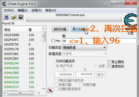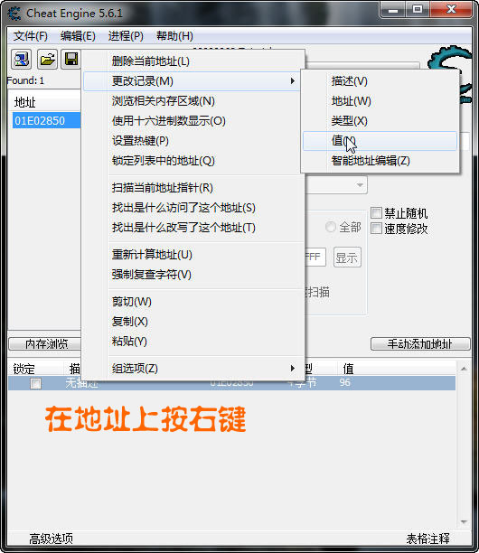 我們再輸入 96 點擊 再次掃描 按鈕 結果只剩1個(這就是我們要找的),我們雙擊此地址將其添加到地址欄: