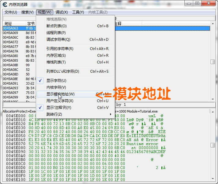 在上面選中 顯示模塊地址 后,如果 0045A063 變成了 Tutorial.exe+5A063 說明這種方法好使。反之如果 0045A063 還是 0045A063 則說明這種方法失效了。至于為什么,你以后會明白。