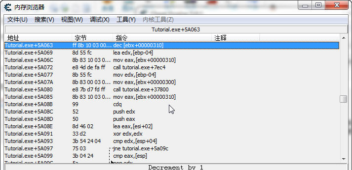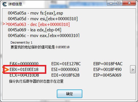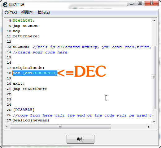 然后按一下打我按鈕,會出現一行匯編代碼 0045a063 - ff 8b 10 03 00 00 - dec [ebx+00000310]