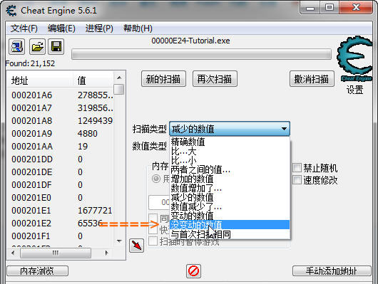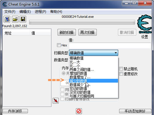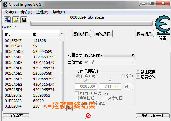 再回到Tutorial ,點擊 打我 => 掃描減少了的數值 => 掃描沒變動的數值 反復操作,最后就會只剩14個地址
