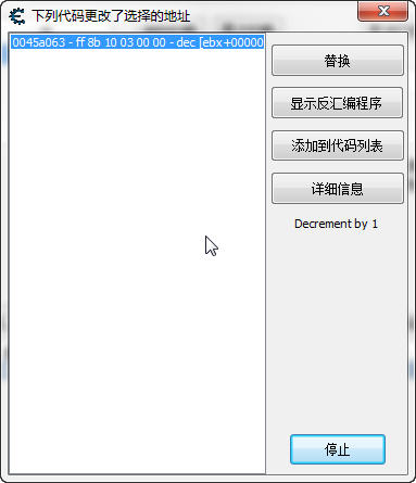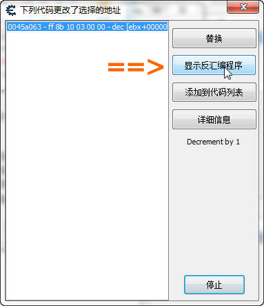 首先找到血量的地址,加入到地址欄,然后在地址上按 右鍵=>找出是什么改寫了這個地址,然后點擊 改變數值 按鈕,出現一行代碼(見第五關),雙擊那行代碼(或者點擊詳細信息)