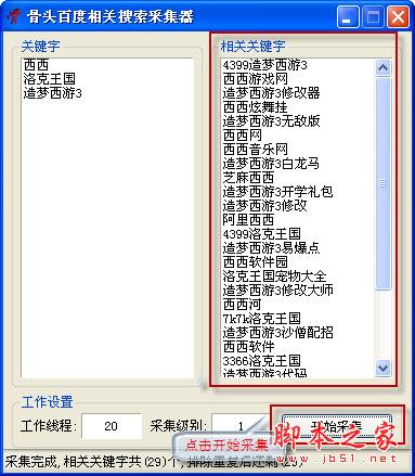 5、點擊“開始采集”,就會在右邊相關關鍵字列表框中出現這幾個關鍵字的相關關鍵字了。