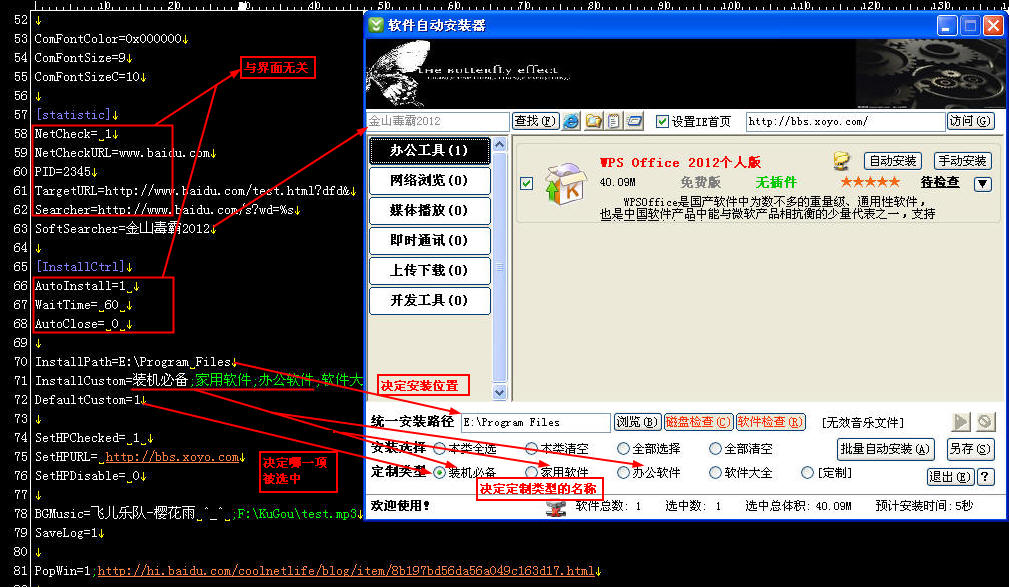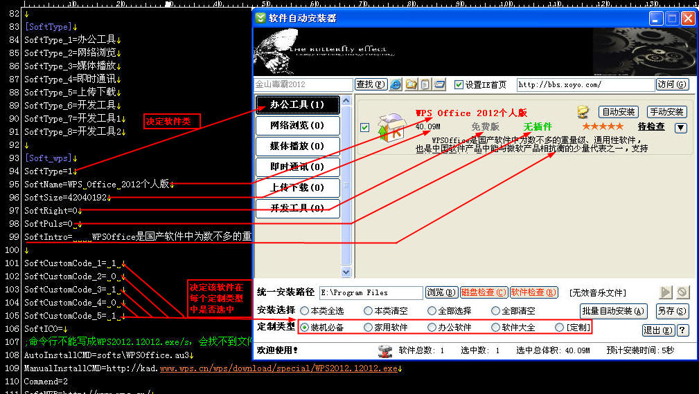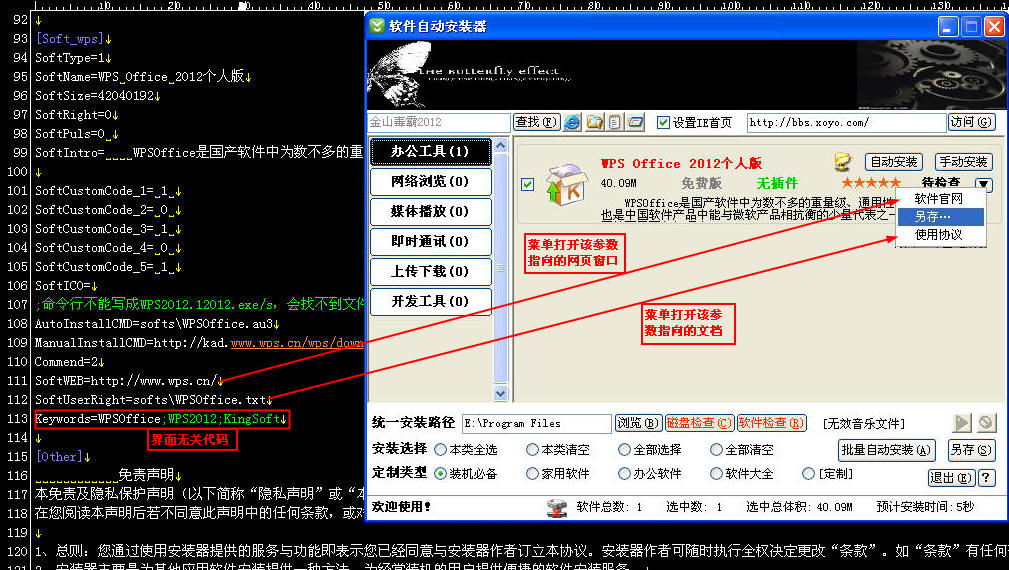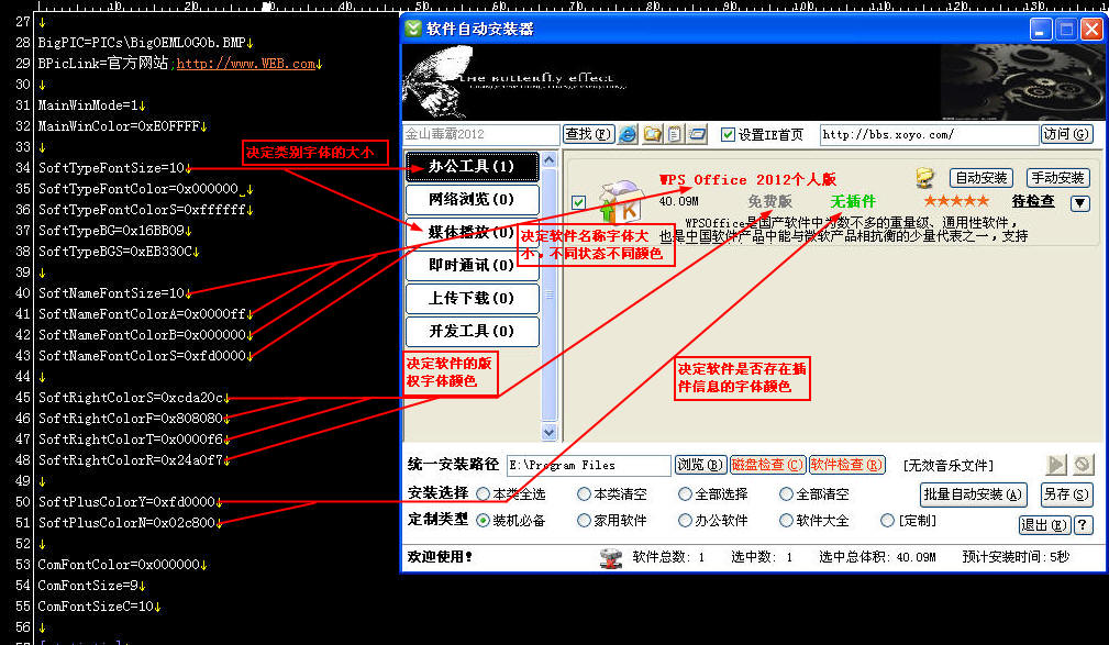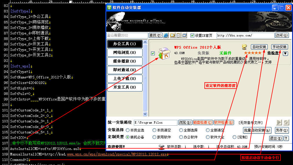 軟件自動安裝器是一種裝機人員常用的軟件,這種軟件實現了多個軟件的批量安裝的功能,節省了大量操作時間。軟件主要通過一個主程序和一個配置文件配合工作,同時利用自動化腳本將每個軟件的安裝包封裝成一個自動化安裝包,由主程序在配置文件的控制下自動調用實現自動安裝。配置文件中包含了軟件信息、安裝控制信息、界面控制信息等內容。配置文件一般采用明碼的文本文件(ini),文件內容有固定的結構和參數但并不復雜,裝機人員很容易編輯和修改。主程序為exe可執行文件,沒有配置文件或配置文件格式不正確主程序都無法執行。
