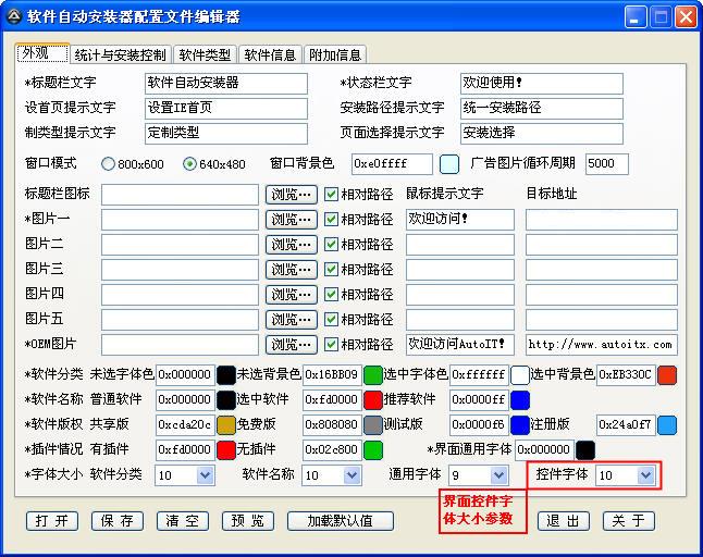 由于界面輸入項較多,為便于錯誤信息的清除設計該功能。該功能會清除當前選項卡的文本框內容,即如果當前操作的是“外觀”選項卡,點擊“清空”按鈕則“外觀”選項卡的文本框輸入項都被清空,但“軟件類型”、“軟件信息”等其他選項卡的文本框輸入項不會清空??梢郧袚Q到其他選項卡使用“清除”按鈕來清空。同樣,也可以使用“加載默認值”功能來重置所有選項卡設置。