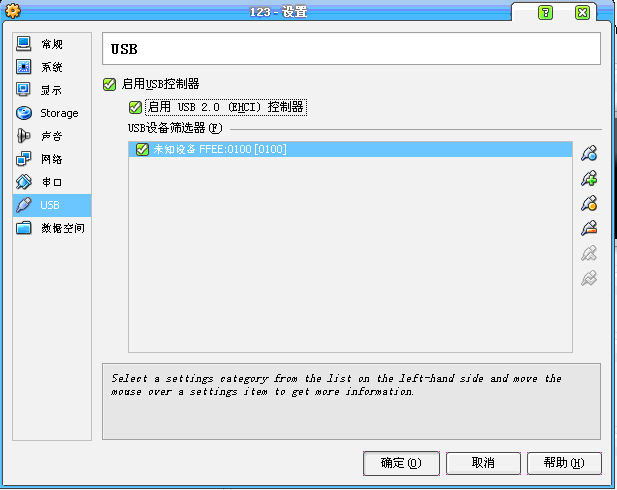 然后在USB篩選器右邊點(diǎn)第二個(gè)圖標(biāo),選擇你的U盤(pán)所顯示的設(shè)備,如我的顯示為“未知設(shè)備 FFEE:0100[0100]”