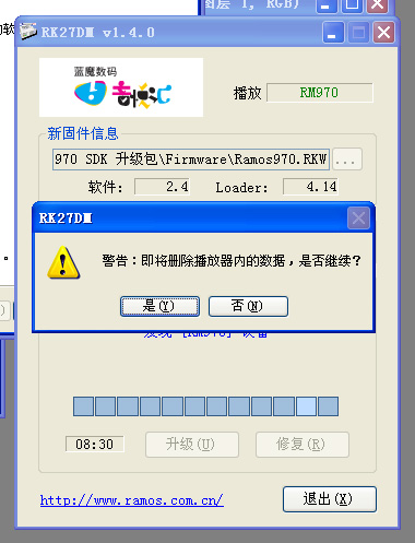 大約經過1分鐘的時間,會彈出上面的警告窗,此時查看RM970的屏幕,應該是顯示充電狀態,切記在這一步驟一直不能斷開USB線,在執行下一步固件升級之前,也不要點擊“確定”按鍵。下一步的操作將在RM970本機上進行。