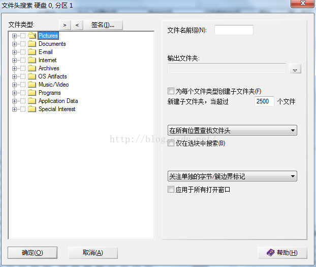 選擇要恢復的硬盤分區,依次打開工具->磁盤工具->通過文件類型恢復,即可打開到如下界面:
