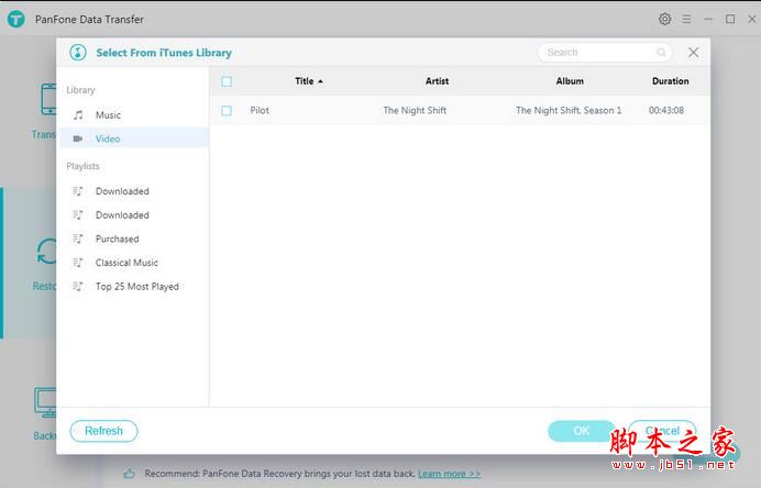 同樣,運(yùn)行PanFone Data Transfer并在主界面上選擇“還原”模式,單擊“ iTunes Library”按鈕,PanFone Data Transfer將在面板中間列出您的iTunes庫(kù)。只需選擇所需的內(nèi)容即可轉(zhuǎn)移到您的設(shè)備。