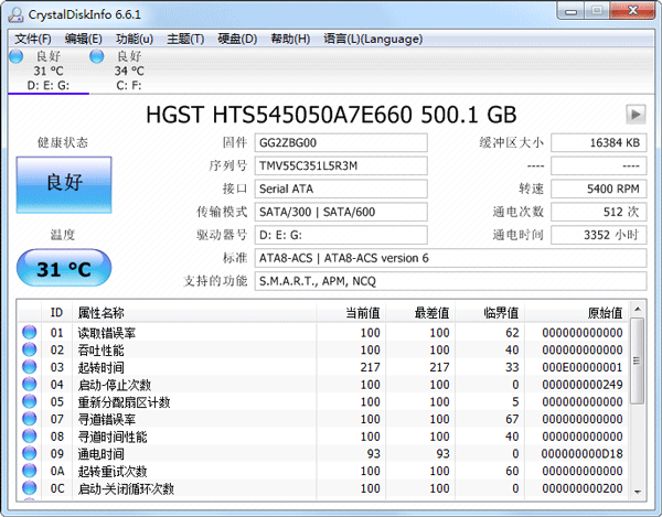 CrystalDiskInfo是一個小軟件,它通過讀取S.M.A.R.T了解硬盤健康狀況。打開它,您就可以迅速讀到本機硬盤的詳細信息,包括接口、轉速、溫度、使用時間等。軟件還會根據S.M.A.R.T的評分做出評估,當硬盤快要損壞時還會發出警報,支持簡體中文,推薦一試。