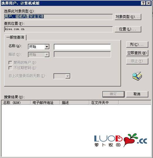 單擊查找窗口中的“高級”按鈕,彈出 “選擇用戶、計算機或組”的窗口來。