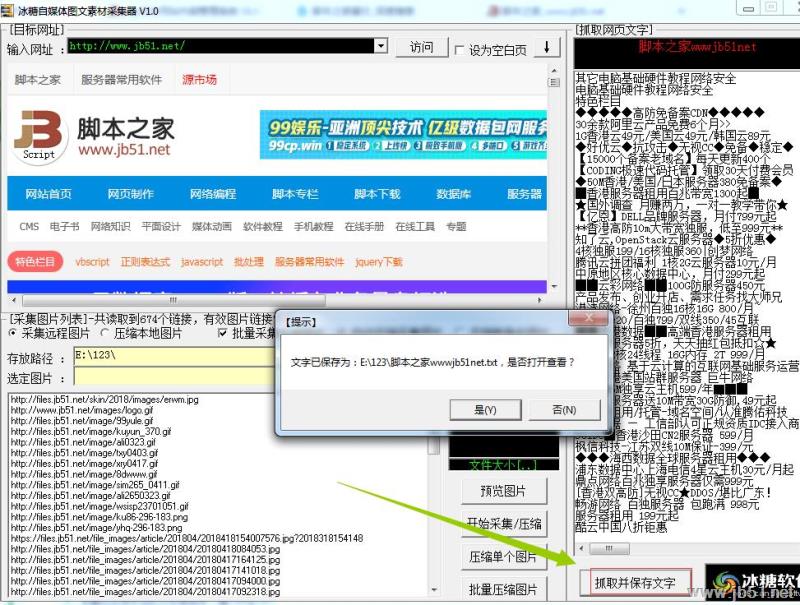 2、待采集的網站圖片鏈接全部出來后(鼠標移動到軟件瀏覽器窗口會提示“網頁加載完畢”),點擊“抓取并保存文字”按鈕,即可自動抓取該網頁內的文字,并自動按標題保存在你指定的“存放路徑”下面(文章篇幅太長的話,軟件右邊文字抓取框可能顯示不完整,這時請打開自動保存的文字采集文件查看)。
