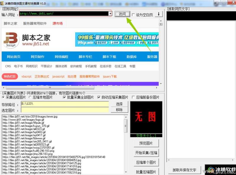 1、運行軟件,在目標網址處輸入你需要采集的網站地址,可以是一個圖片站或是一篇文章、小說,或者是圖文版網頁,然后點擊“訪問”按鈕等到軟件徹底打開該網頁后,采集圖片列表會自動列出該頁面所包含的圖片鏈接。