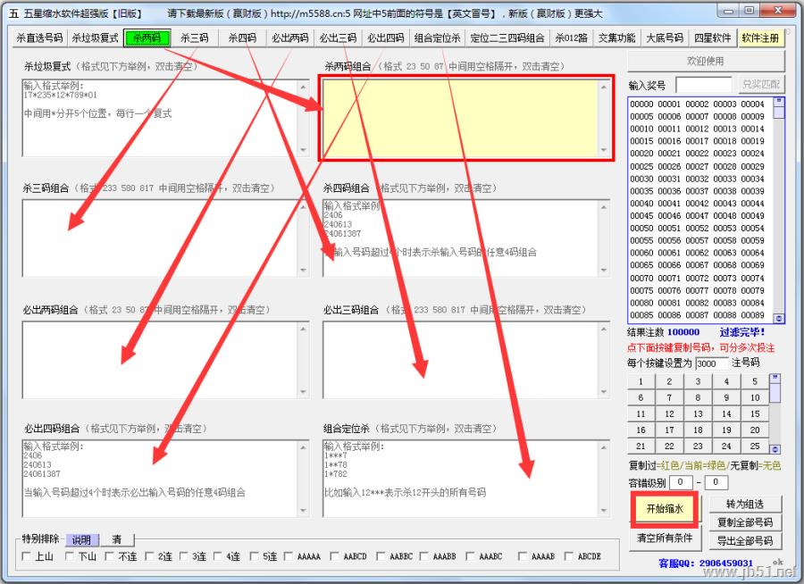 1、【殺直選】:在方框內輸入你不想要的直選號碼,可以粘貼進去,每注號碼用空格隔開,也可以直接導入號碼。