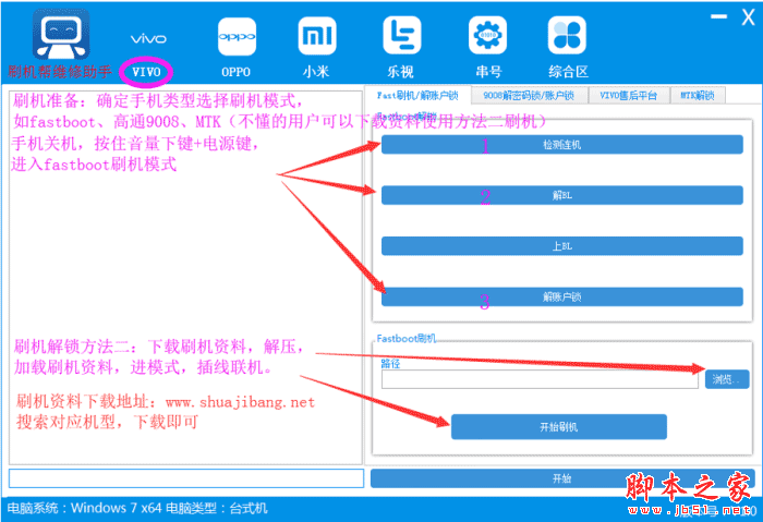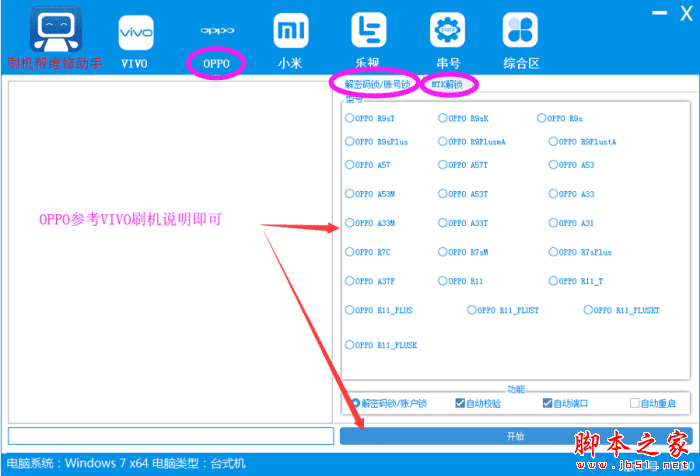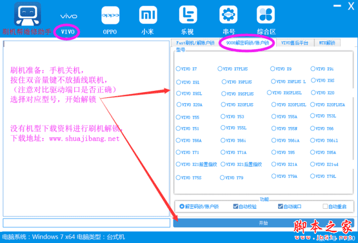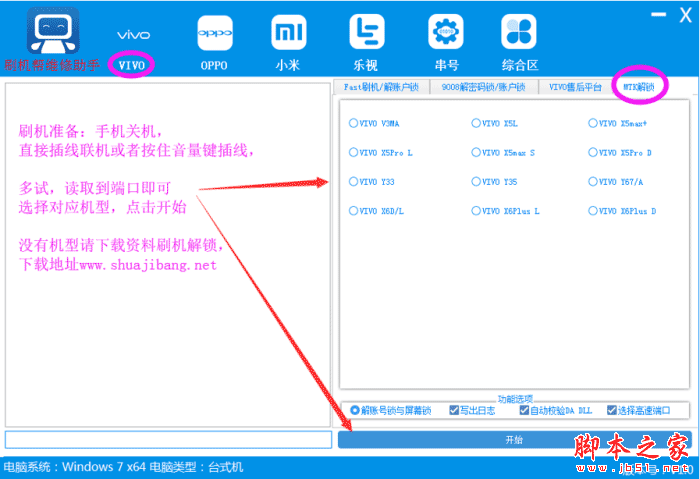vivo MTK解鎖:手機關(guān)機,直接插線聯(lián)機或者按住音量鍵插線,多試幾次,讀取端口即可。選擇對應(yīng)型號,點擊開始。