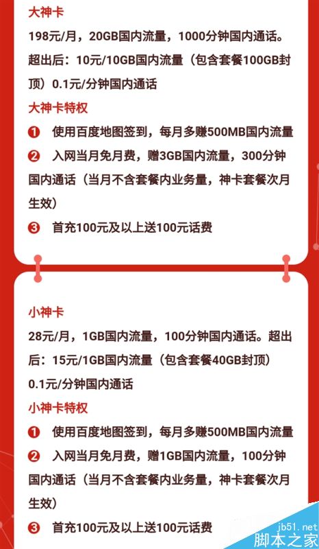 百度神卡與中國(guó)聯(lián)通合作(號(hào)段176),分為大神卡和小神卡,具體資費(fèi)套餐信息如下:
