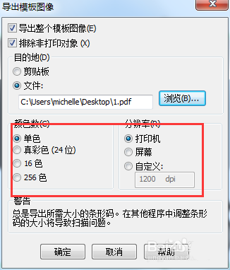 3、返回導出對話框,有需要的設置“顏色數”、“分辨率”,然后單擊確定,就可以導出模板為pdf文件。