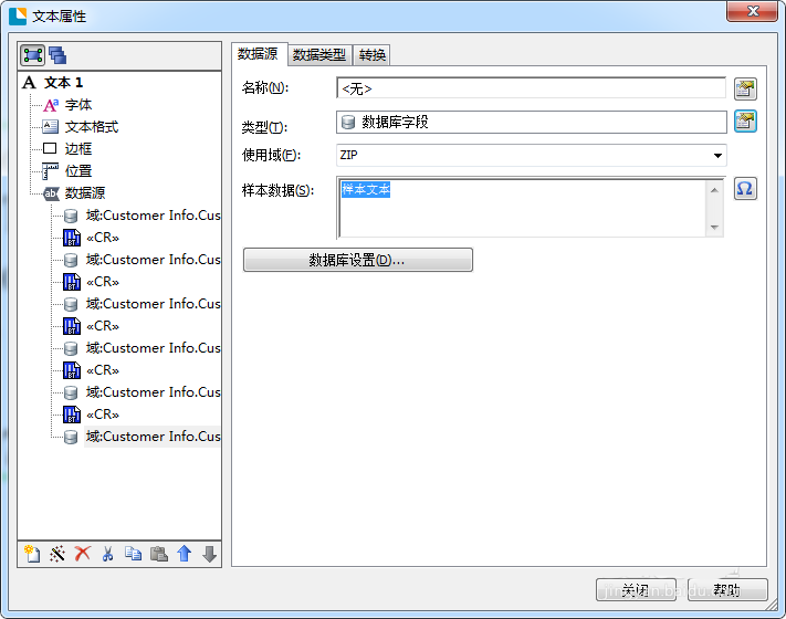 1、在BarTender 2016中,新建“多行”文本,連接數據庫;在這里,小編給大家演示的是文本數據庫,以“,”為分隔符;然后選擇“使用域”,如下: