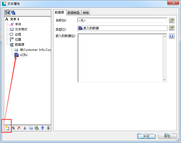 2、單擊左下角的“新建數據源向導”圖標,選擇“嵌入的數據”作為數據源類型。關閉該向導后,在“嵌入的數據”字段中,按回車鍵以換行;