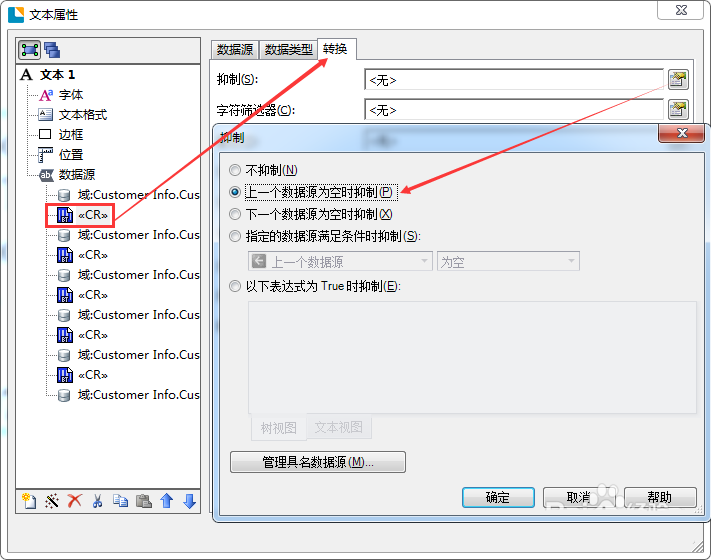 5、依次選擇包含“回車”的嵌入數據源,選擇“數據源”屬性頁上的“轉換”選項卡,單擊“抑制”旁邊的圖標按鈕以打開“抑制”對話框,選擇“上一個數據源為空時抑制”,單擊“確定”以關閉“抑制”對話框。