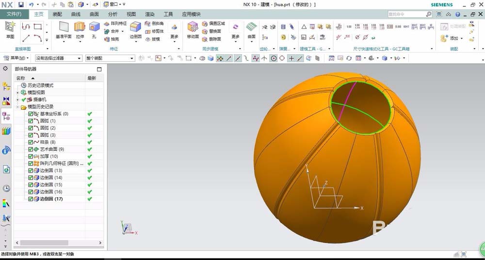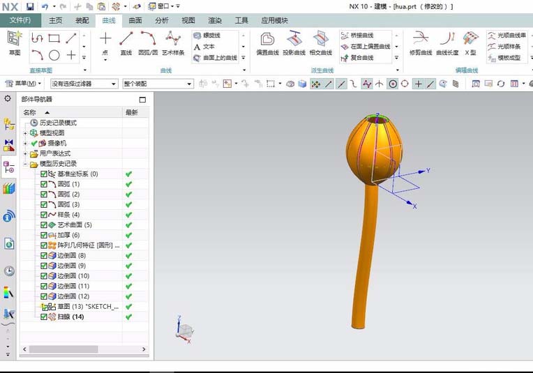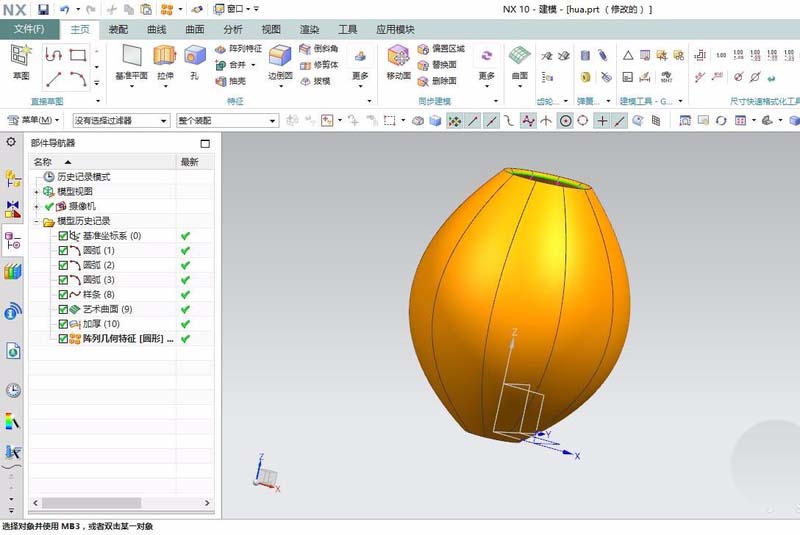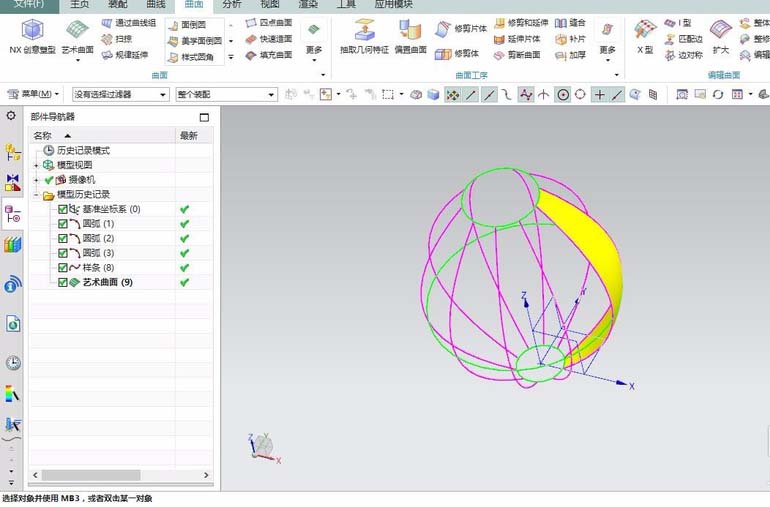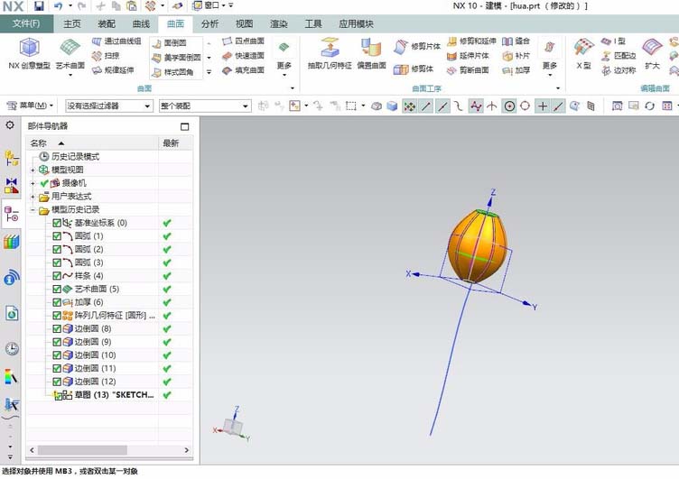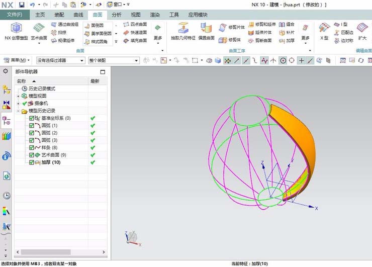 3、移動該藝術樣條,然后使用通過藝術曲面命令來縫合,并進行加厚,加厚為1mm。