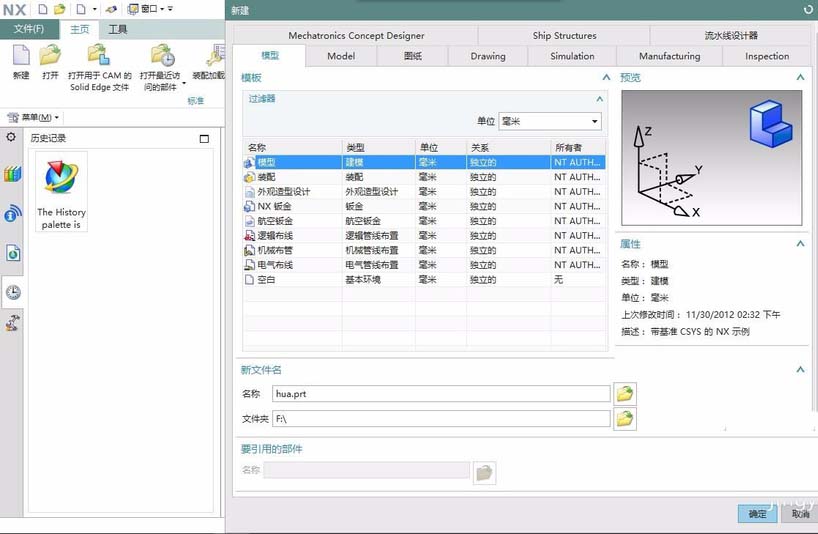 1、打開UG10.0軟件,其他版本的軟件都可以,新建一個hua.prt的模型文件。