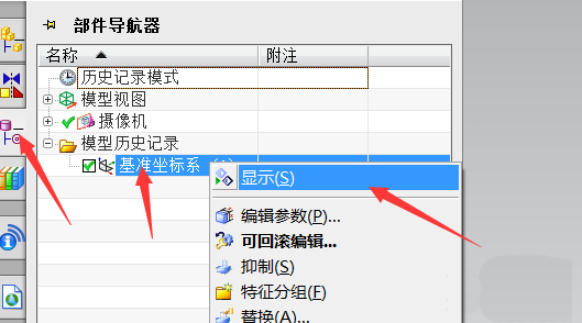 3、如下圖所示,在左側(cè)單擊部件導(dǎo)航器,彈出部件導(dǎo)航器菜單。菜單欄單擊“基準(zhǔn)坐標(biāo)系”選項,彈出菜單。如下圖所示,單擊顯示,基準(zhǔn)坐標(biāo)系即可顯示出來。