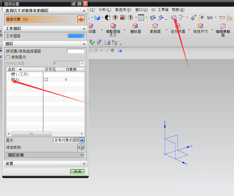 3、單擊“圖層設(shè)置”,彈出如下菜單,將61圖層勾選即可將隱藏的基準(zhǔn)面顯示出來。