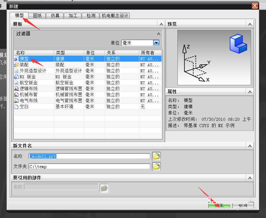 2、彈出對話框,選中模型標(biāo)簽下的模型選項,單擊確定。