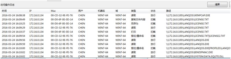 其次,一旦有局域網(wǎng)用戶訪問共享文件,然后系統(tǒng)會實(shí)時(shí)輸出用戶的具體訪問行為,同時(shí)還會將日志寫入到數(shù)據(jù)庫中,從而便于管理員事后備查和審計(jì)。如下圖所示: