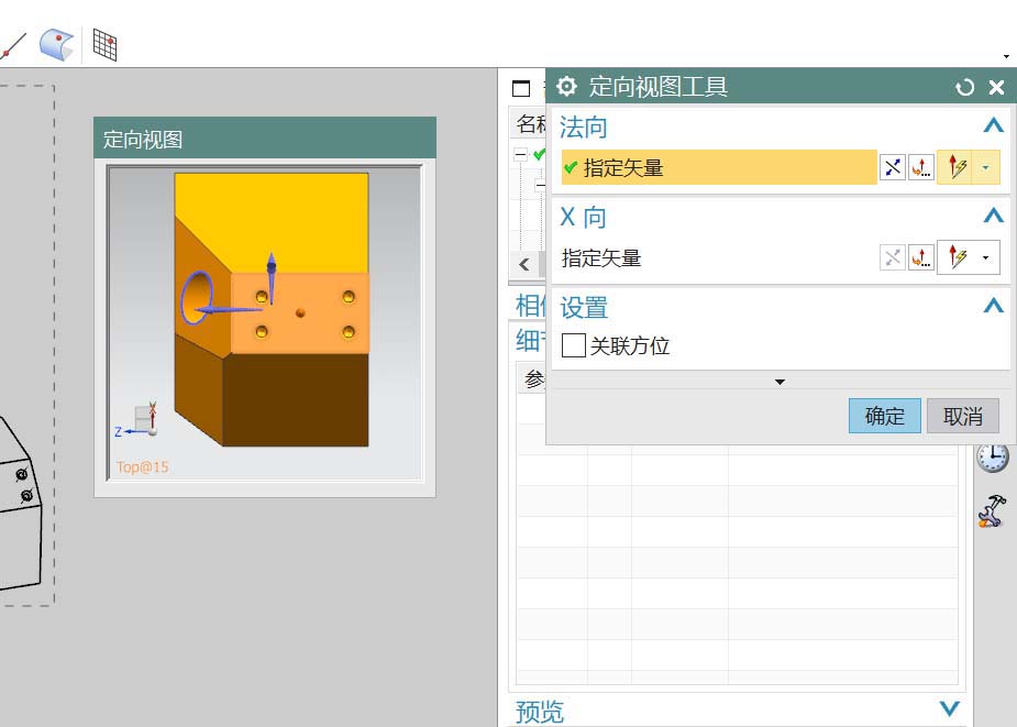 4、打開定向視圖工具后,讓法向矢量為自動判斷,鼠標點選要定向的面;可以按中鍵擺好模型的方向,按F8擺正模型。即可得所要視圖。