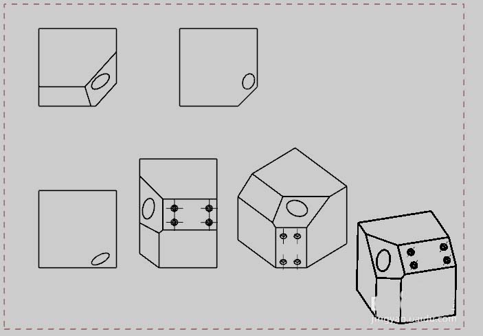 2、如圖所標,想要將箭頭所示面設為平面好標注尺寸,用普通的三視圖是沒有辦法標注的。