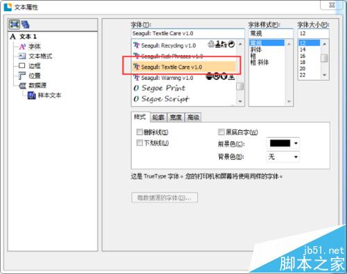 在BarTender模板中新建一個文本,在字體選項中選擇字體為“Seagull:Textile Care v1.0”,然后在數據源中輸入對應該洗滌標志的字符后就可以看到該洗滌標志了,它的大小可自由控制。