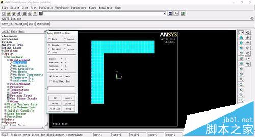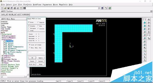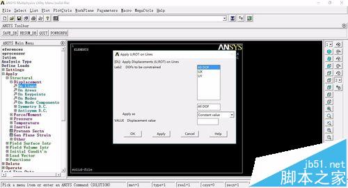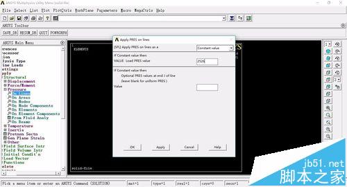 3、施加載荷,在模型的左端施加固定邊界條件,main menu --solution--define loads--apply--structural--displacement--on lines在模型的上端施加端部均部壓力,main menu --solution--define loads apply--structural--pressure--on lines,壓力值為2625.