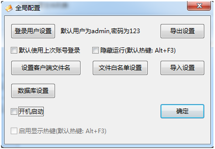 這里可以設置登錄用戶名、客戶端名稱、文件白名單、數據庫設置、開機啟動以及將策略導出或導入。如下圖所示: