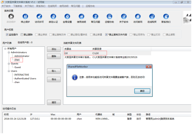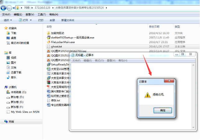 至此,我們就完成了對大勢至共享文件審計系統的配置,這樣就可以全面保護局域網共享文件的安全了。然后,當用戶訪問共享文件時就會被限制,如下圖所示: